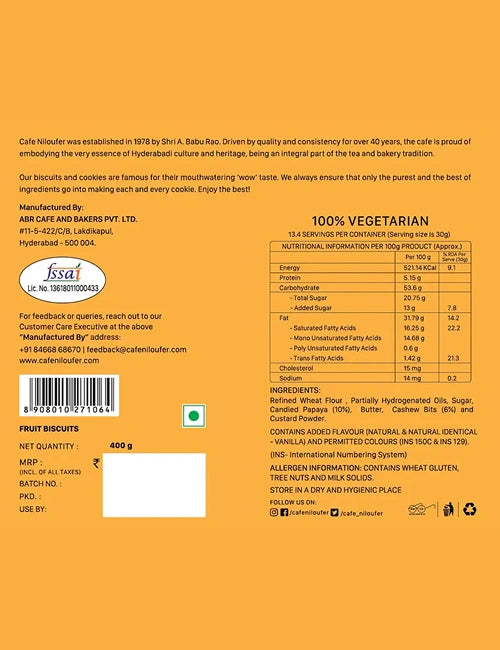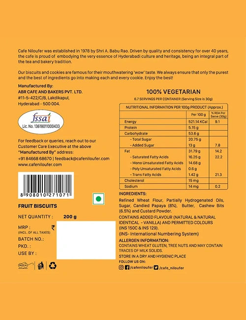 Remember those colorful, tutti-frutti biscuits from your childhood? Our Fruit Biscuits bring back that pure joy with every bite. Bursting with chewy, colorful fruit pieces and a melt-in-your-mouth texture, these beloved treats are crafted to perfection at Café Niloufer.
