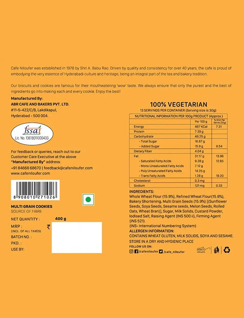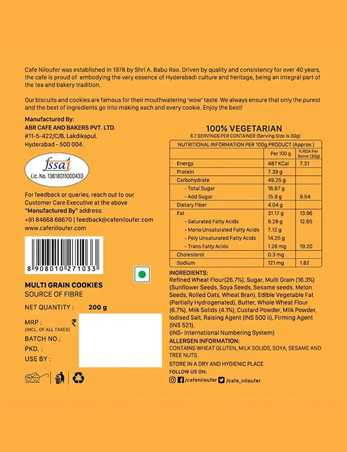 Packed with the goodness of 9 grains like Oats, Corn, Rice, Almond, Sesame Seeds, Flax Seeds, Ragi, Whole Wheat, Sunflower Seeds, our yummy Multigrain Biscuits are a perfect source of rich fibre making it an ideal mid day snack!