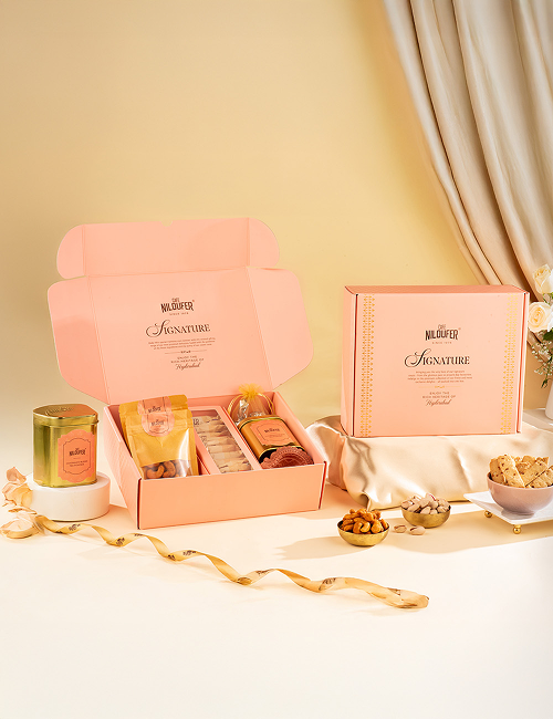 Curated hamper of our Assorted Cookies,Peri Peri Cashews, Salted Pistachios,Chocolates, Almond Sticks, our Limited Chairman's Blend Tea Powder, and a Diya.
