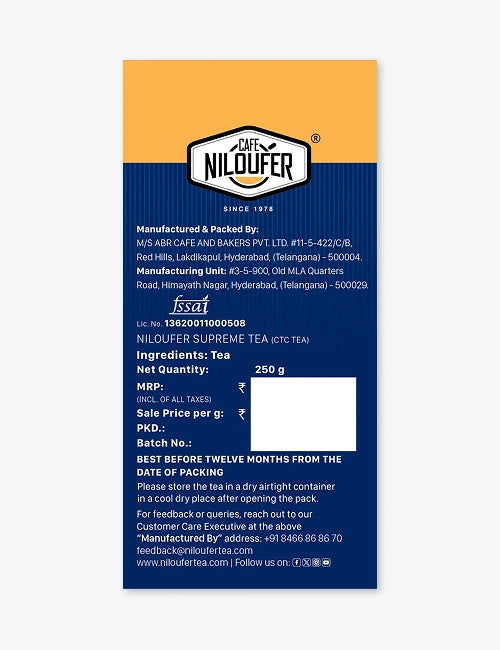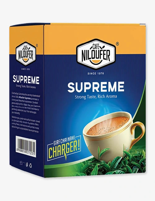 Bold, brisk, and bursting with flavor—Cafe Niloufer Supreme Tea is the perfect pick-me-up for any moment of the day. Expertly blended for a strong taste and refreshing aroma, this tea invigorates your senses with every sip. Whether you need an energizing start or a rejuvenating break, Supreme Tea is your go-to for a perfectly brewed cup of strength and refreshment.
